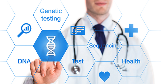 Photo Caption: Genetic testing concept with DNA icon and words on a screen and a medical doctor touching a button, isolated on white background