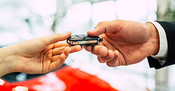 Photo Caption: Handing of car keys. The car seller in the dealership passes the keys to the young woman.