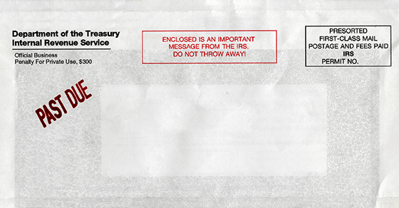 Photo Caption: Envelope from the U.S. Internal Revenue Service with "Important Message" notice and Past Due in red. Clipping path included.